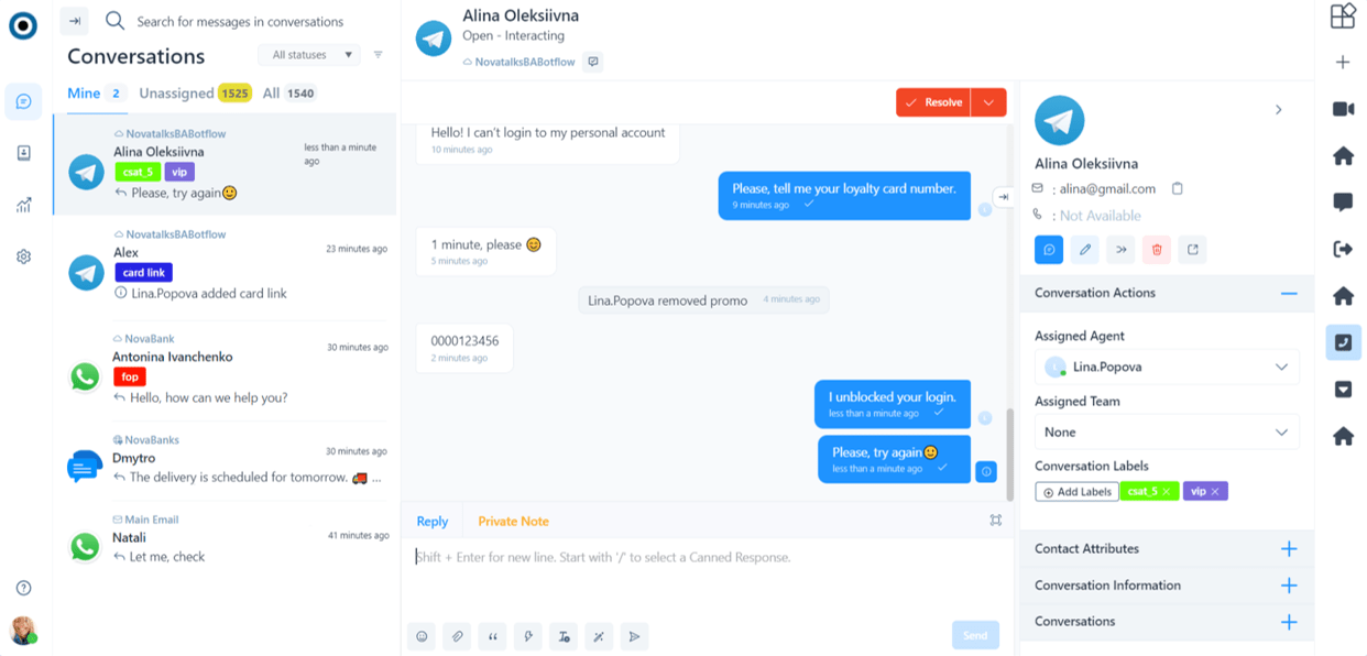 Set up chatbots and automated responses for round-the-clock customer support. Use all the capabilities of AI to ensure the highest level of service. | Customer data and their contact history are stored on the platform. Use segmentation and assign tags to provide personalized service. | NovaTalks stores and analyzes important information using BI systems and text analytics. Gain valuable insights and improve sales and service. |
